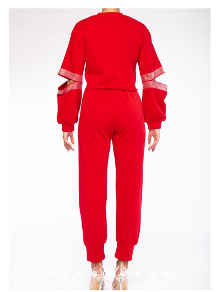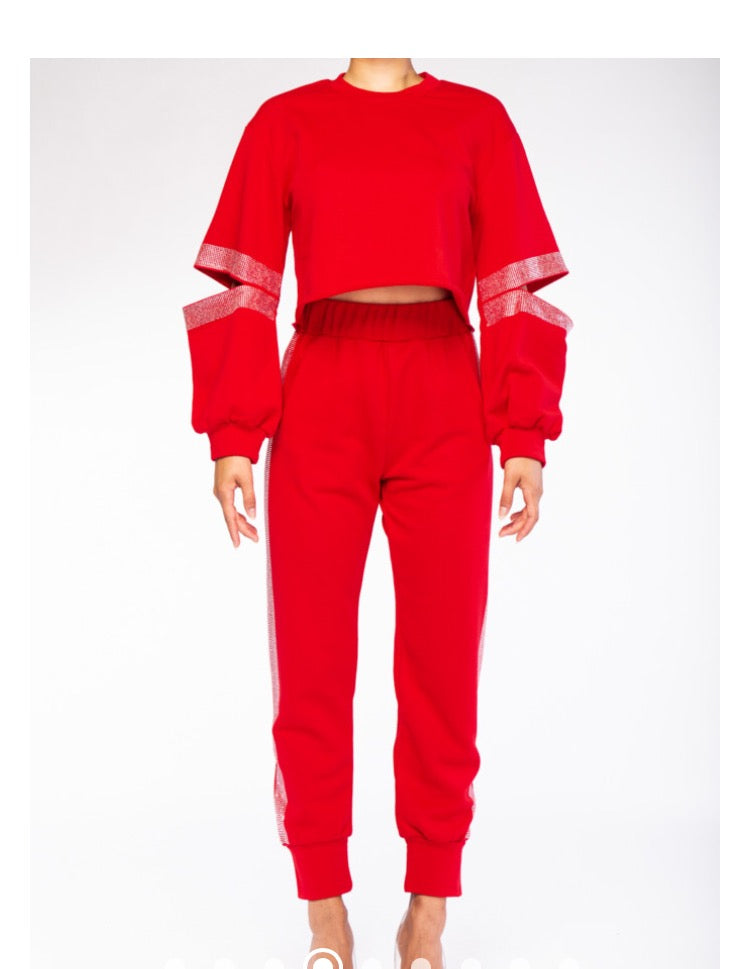 Red jogger-60%cotton,40%polyester with rhinestone on the elbow area and on the sides of the pants